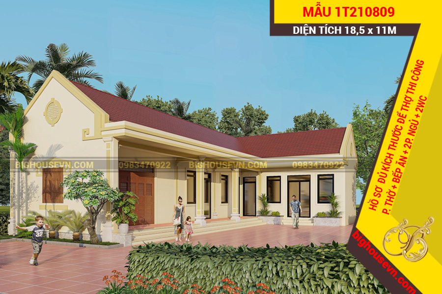 9. Mẫu nhà 1 tầng mái Thái 3 phòng ngủ 210m2