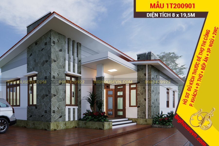 19. Mẫu nhà 1 tầng mái Nhật 3 phòng ngủ 200m2