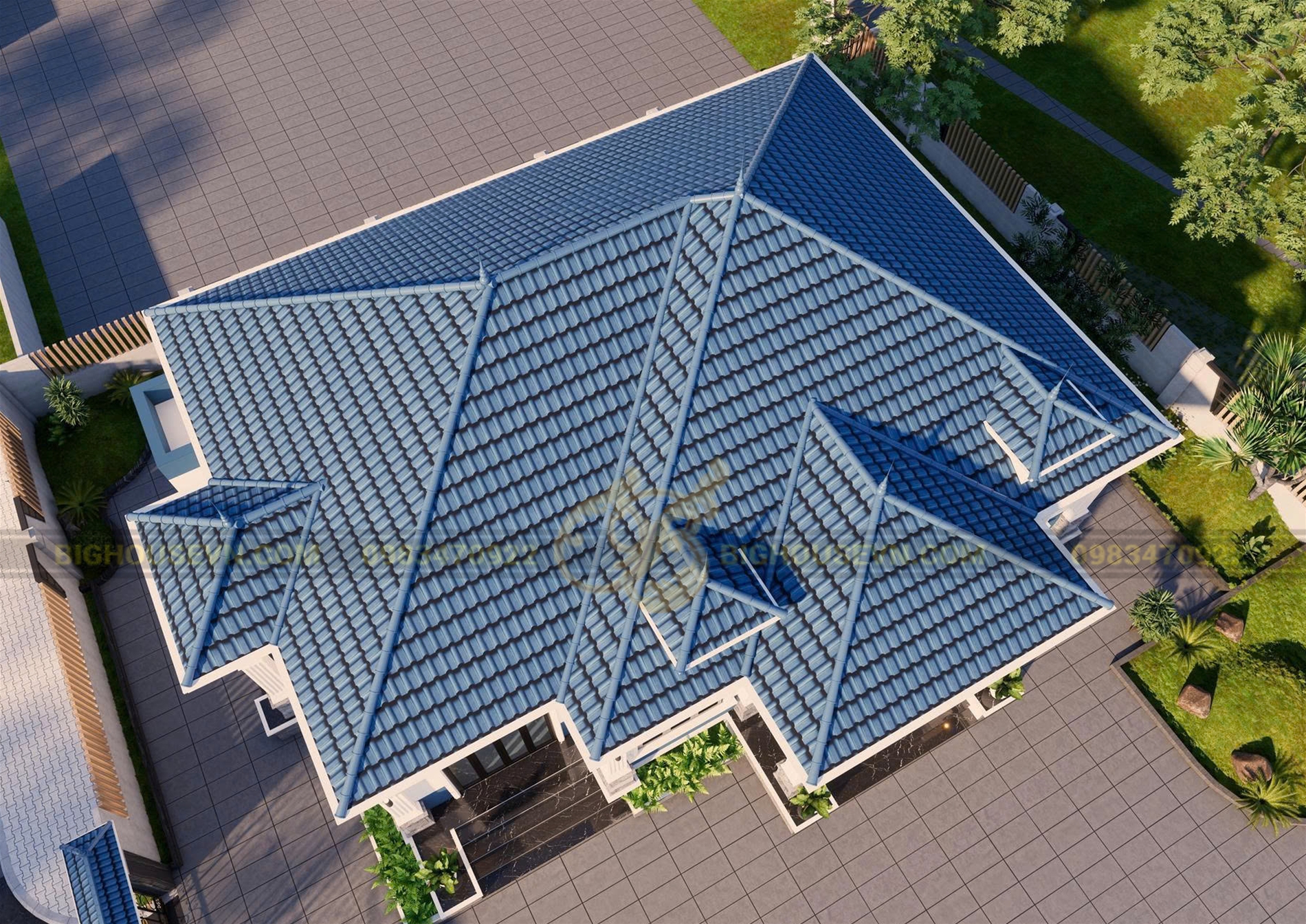Phối cảnh trên cao nhà vườn cấp 4 mái nhật rộng 14m