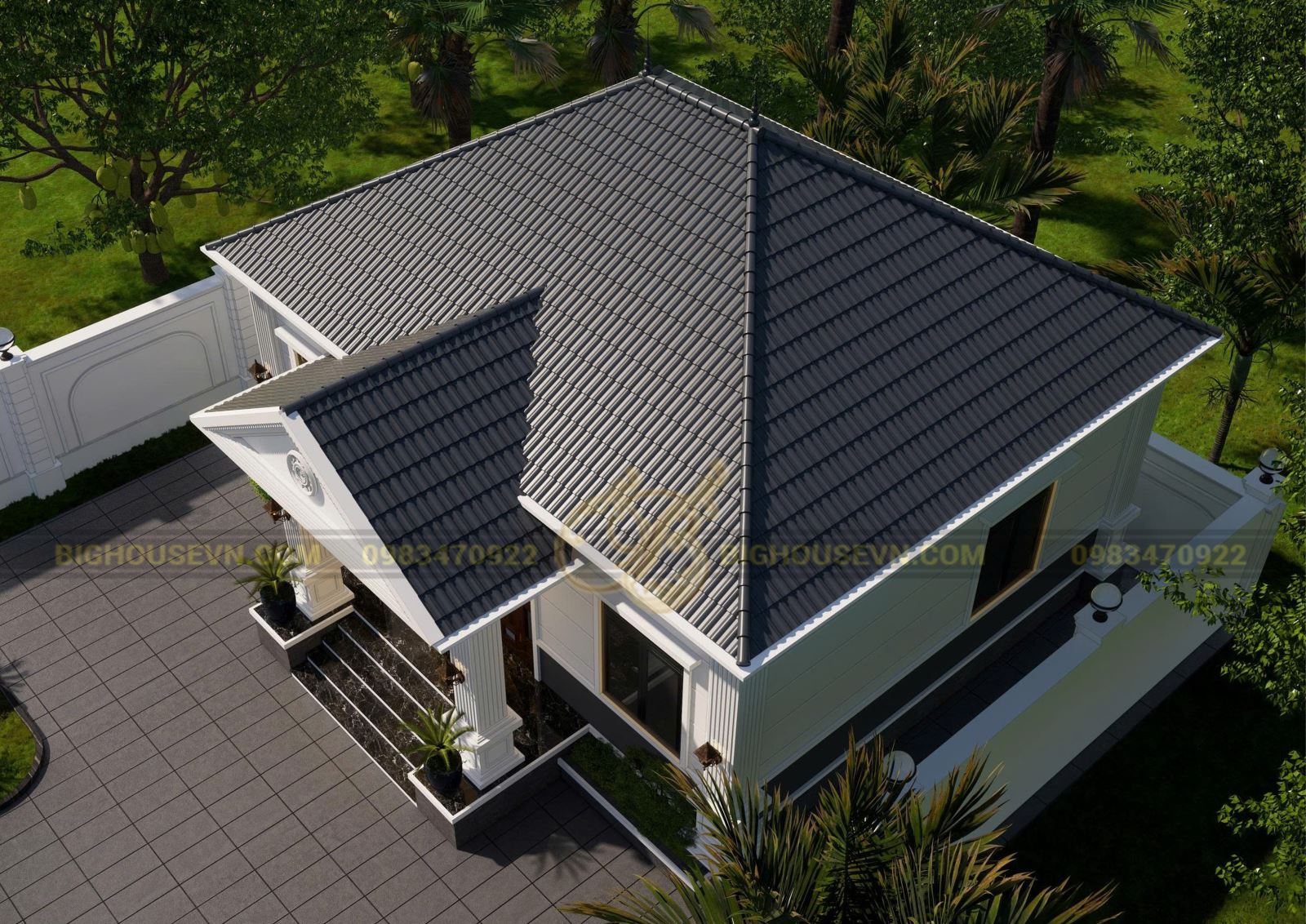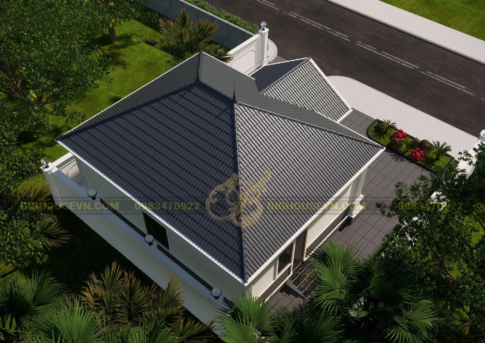Phối cảnh trên cao nhà cấp 4 mái nhật 82m2 4 ngủ