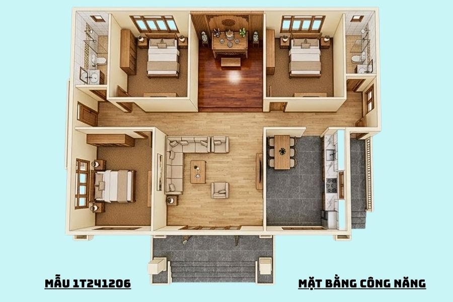 Công năng: 3 phòng ngủ, Phòng khách, Phòng thờ, Phòng bếp ăn và 2wc