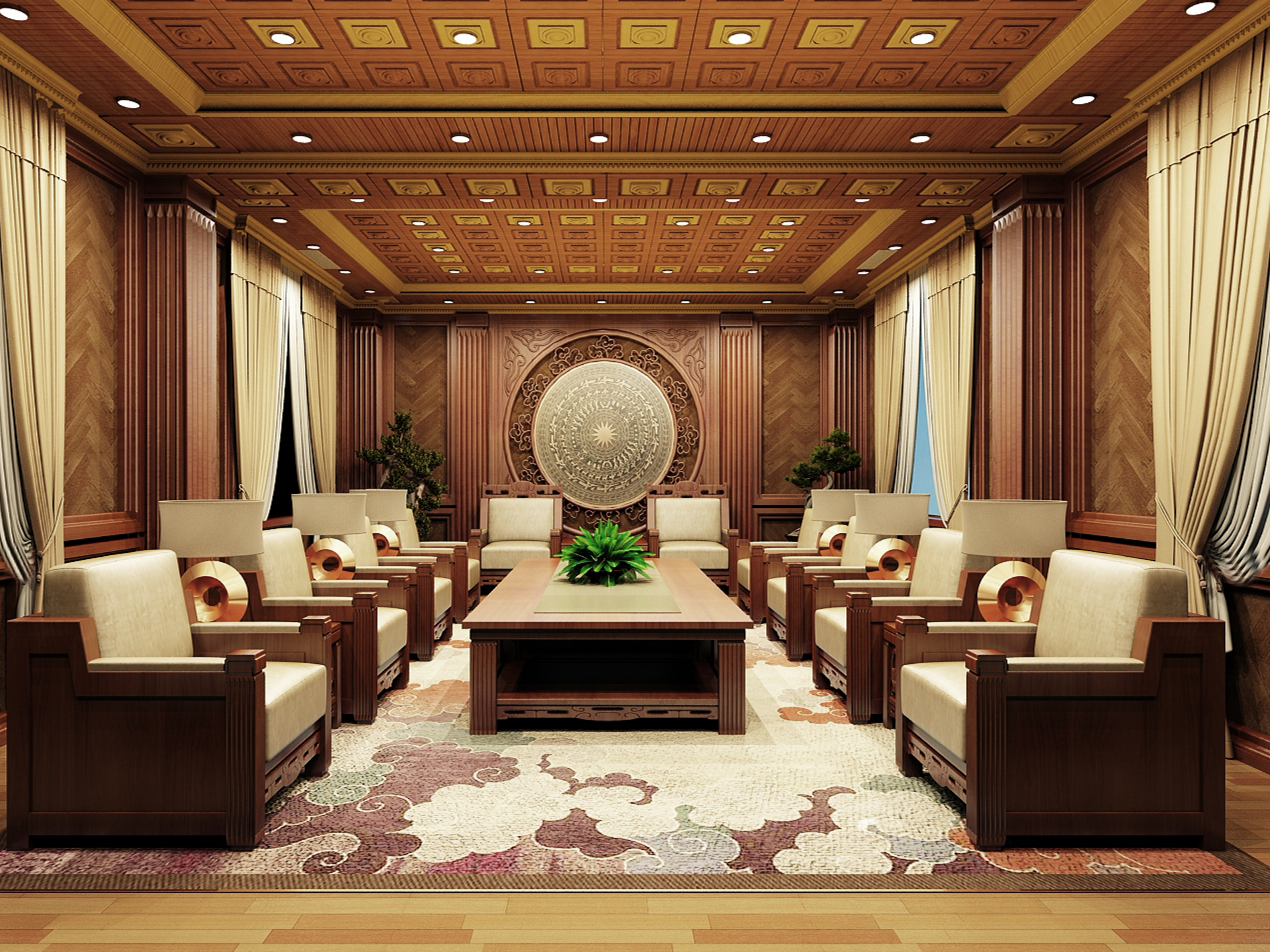 Phòng họp lãnh đạo được thiết kế theo phong cách truyền thống mang đậm bản sắc dân tộc từ chi tiết trống đồng hay màu gỗ tự nhiên, nhưng cũng không kém phần hiện đại, sang trọng khi có thêm những chi tiết như hoa văn ở bộ bàn ghế, ốp trần, hay đèn bàn. Màu sắc cũng được KTS chọn lọc và làm cho không gian phòng họp hài hòa, những cũng thật nổi bật, tinh tế.