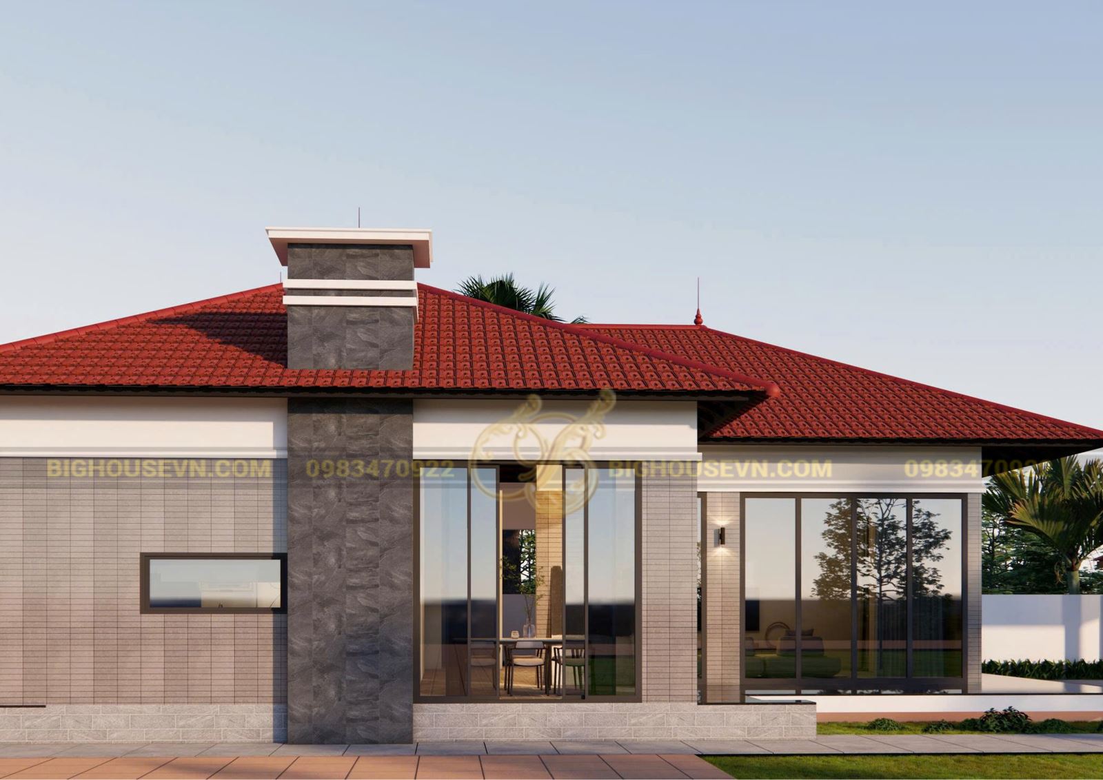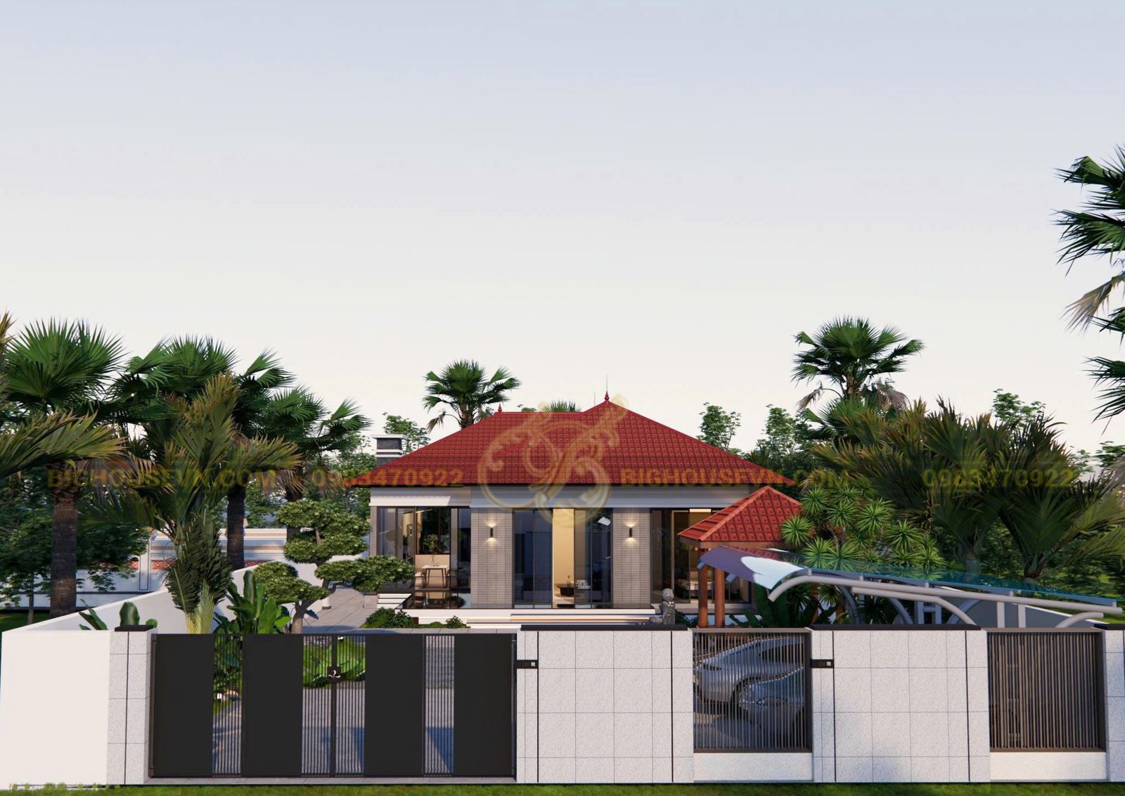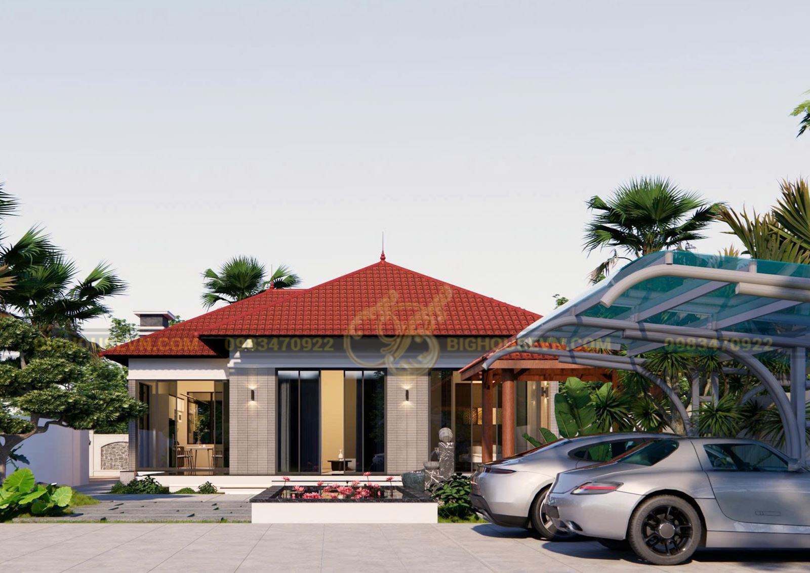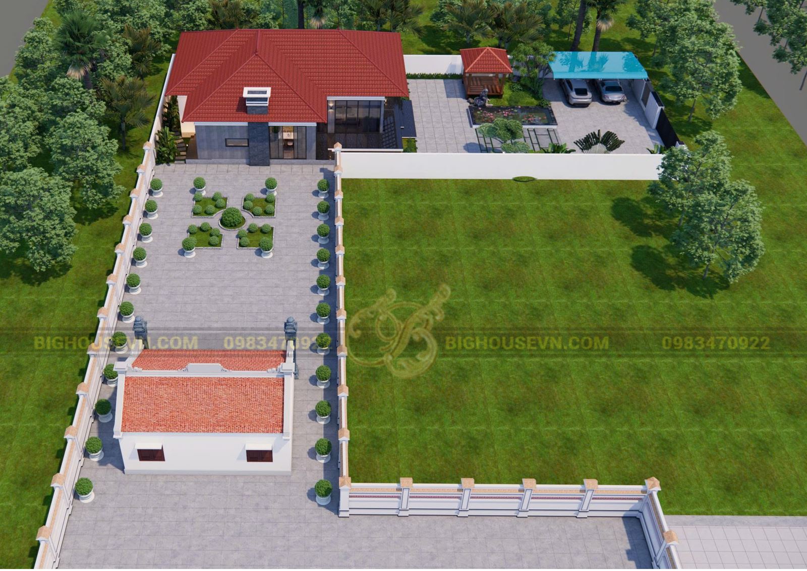phối cảnh mặt bên nhà vườn cấp 4 chữ L 13x16m